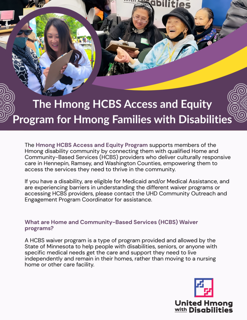 UHD’s Hmong HCBS Access and Equity Program supports members of the Hmong disability community by connecting them with qualified Home and Community-Based Services (HCBS) providers who deliver culturally responsive care in Hennepin, Ramsey, and Washington Counties, empowering them to access the services they need to remain in their homes and thrive in the community.